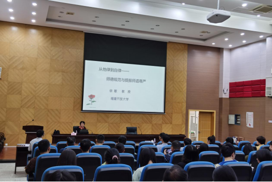 育人之道,师德为先。为强化教师的使命担当,进一步加强学院师德师风建设,12月14日下午,由福建省教育厅主办、福建教育学院与我校联合承办的师德大讲堂活动在我院学术报告厅举行,福建开放大学徐敏教授作了《从他律到自律——师德修养与提振师道尊严》为主题的师德师风专题讲座。学院党委委员、副院长花文苍,2020-2021年新入职教职工、各系部教师代表参加此次学习活动。