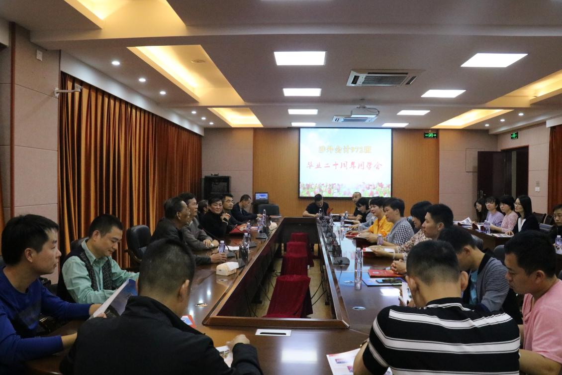 2020年11月14日,原泉州商业学校涉外会计972班毕业20周年回访母校座谈会在行政楼二楼会议室举行。学院党委委员、副院长花文苍,校友办主任陈贵图,涉外会计972班班主任黄甬穗、科任教师林振能以及30多名同学参加了座谈会。