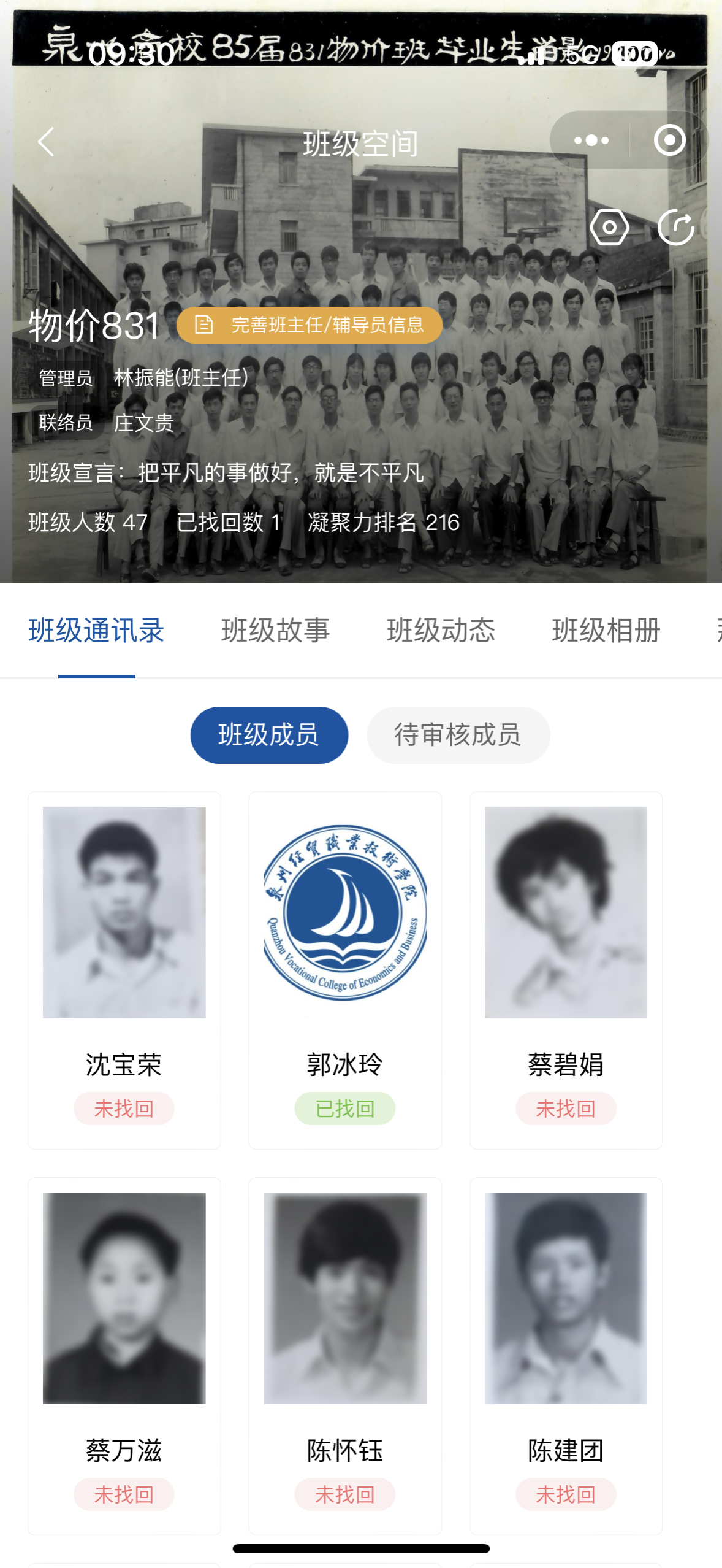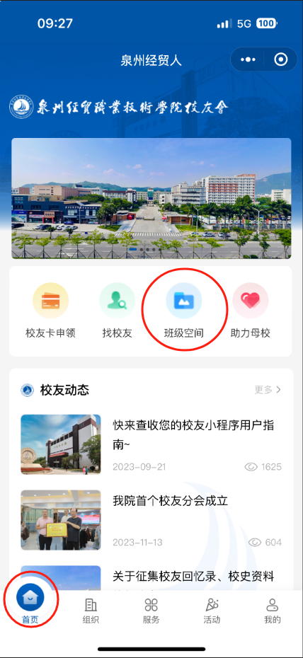 认证校友在小程序首页,点击“班级空间”即可进入班级空间平台,在“查找班级”中,找到自己的班级,点击“加入班级”即可申请加入班级;如你已经在此班级中,点击自己的信息即可点亮通讯录。加入成功或点亮通讯录后,即可查看班级动态、班级相册,参与班级活动等。